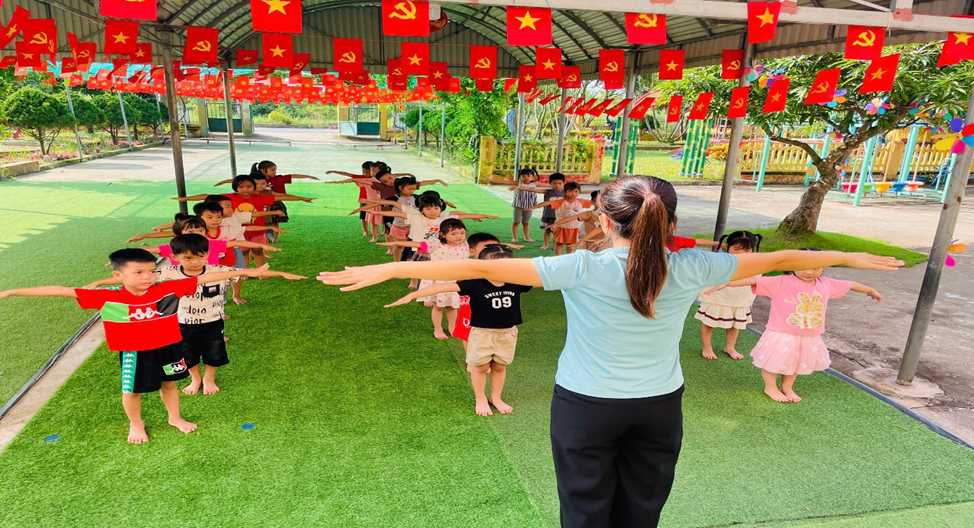 Thời gian tập thể dục buổi sáng là lúc bé được luyện tập những bài tập nhẹ nhàng, tạo sức khỏe và tâm thế vui vẻ, phấn khởi chuẩn bị cho một ngày mới hoạt động ở trường.